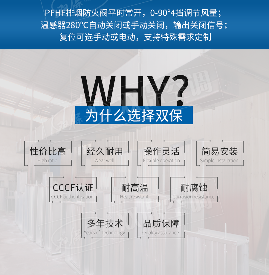 【閥門特點】CCCF認證,輕巧實用,安全可靠,壽命長久。一般應用于火災排煙管穿越防火墻處,煙氣溫度超過280度時自動熔斷關閉,可聯動關閉排煙風機。